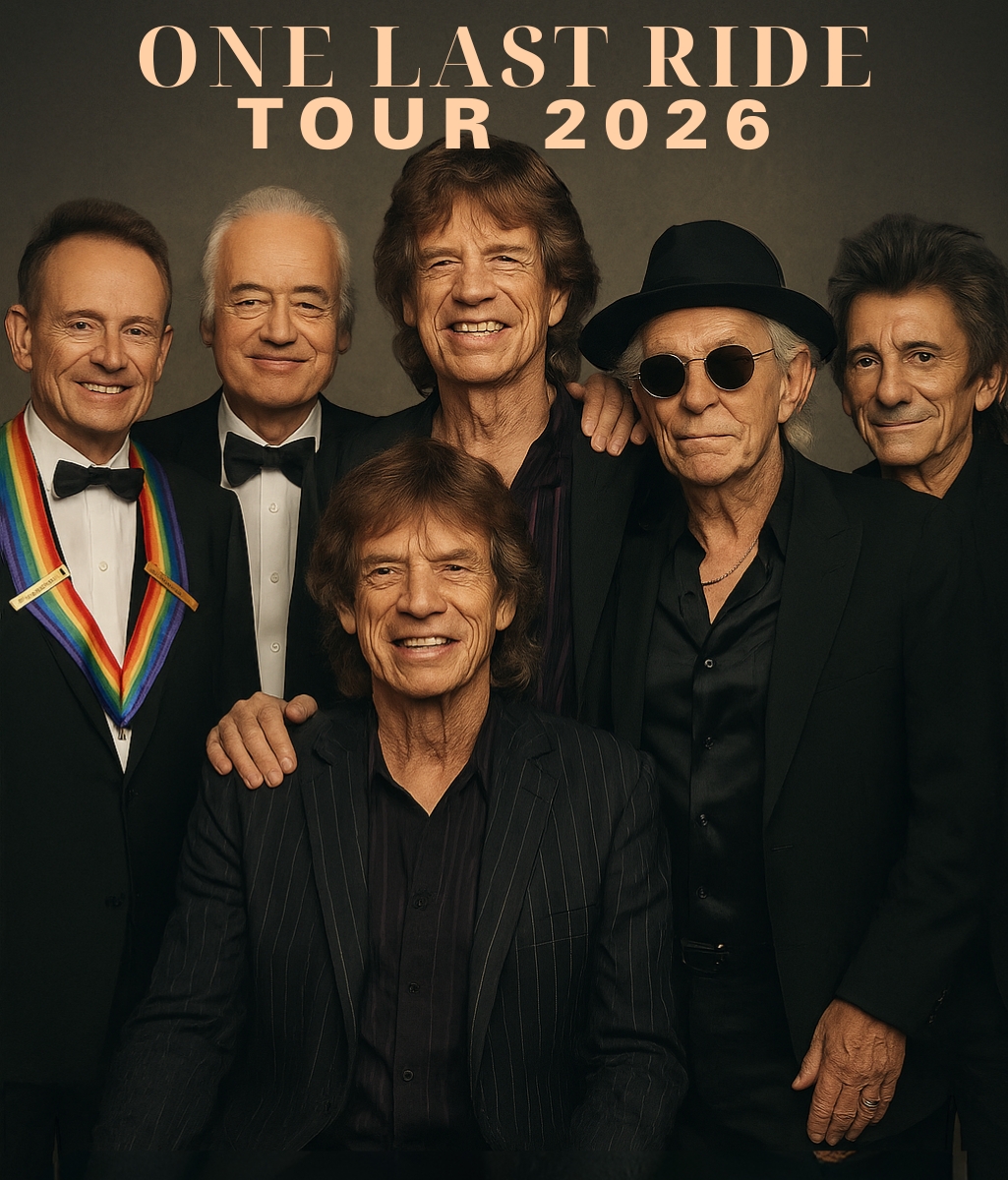In a revelation that has shaken the foundation of modern music, One Last Ride 2026 will bring together six of the most iconic names ever to plug in an amp, strike a chord, or bring a stadium to its knees: Jimmy Page, Robert Plant, and John Paul Jones of Led Zeppelin, and Mick Jagger, Keith Richards, and Ronnie Wood of The Rolling Stones.